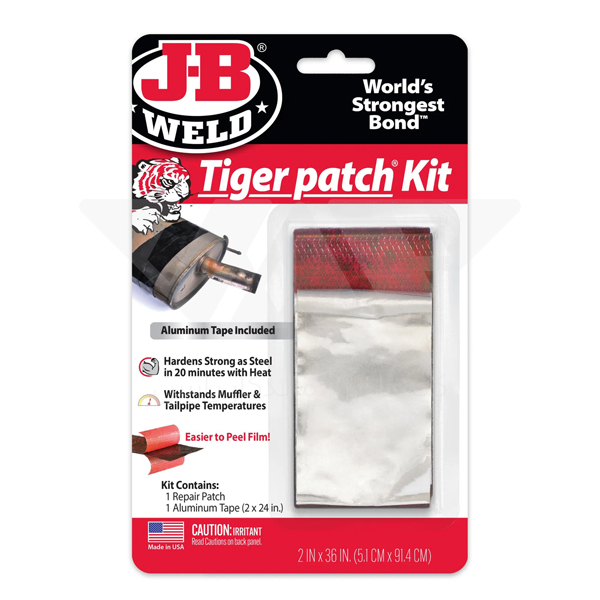 چسب جوش اگزوز جی بی ولد Tiger Patch Kit JB-WELD یک روکش فایبرگلاس با روکش اپوکسی است که تا دمای ۲۷۵ درجه سانتیگراد را تحمل می‌کند.